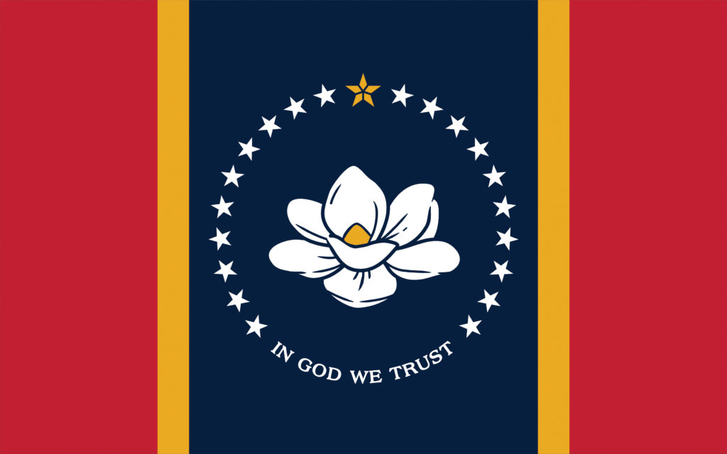 The new Mississippi flag has the state flower on a dark blue background with red bars on either end. The magnolia is encircled by stars representing Mississippi as the 20th state. The flag also has a single star made of diamond shapes representing the Native American people who lived on the land before others arrived.